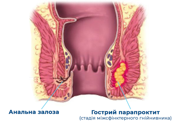 Гострий парапроктит – це гнійне запалення м’яких тканин, що оточують пряму кишку і задній отвір (гнійник, абсцес).